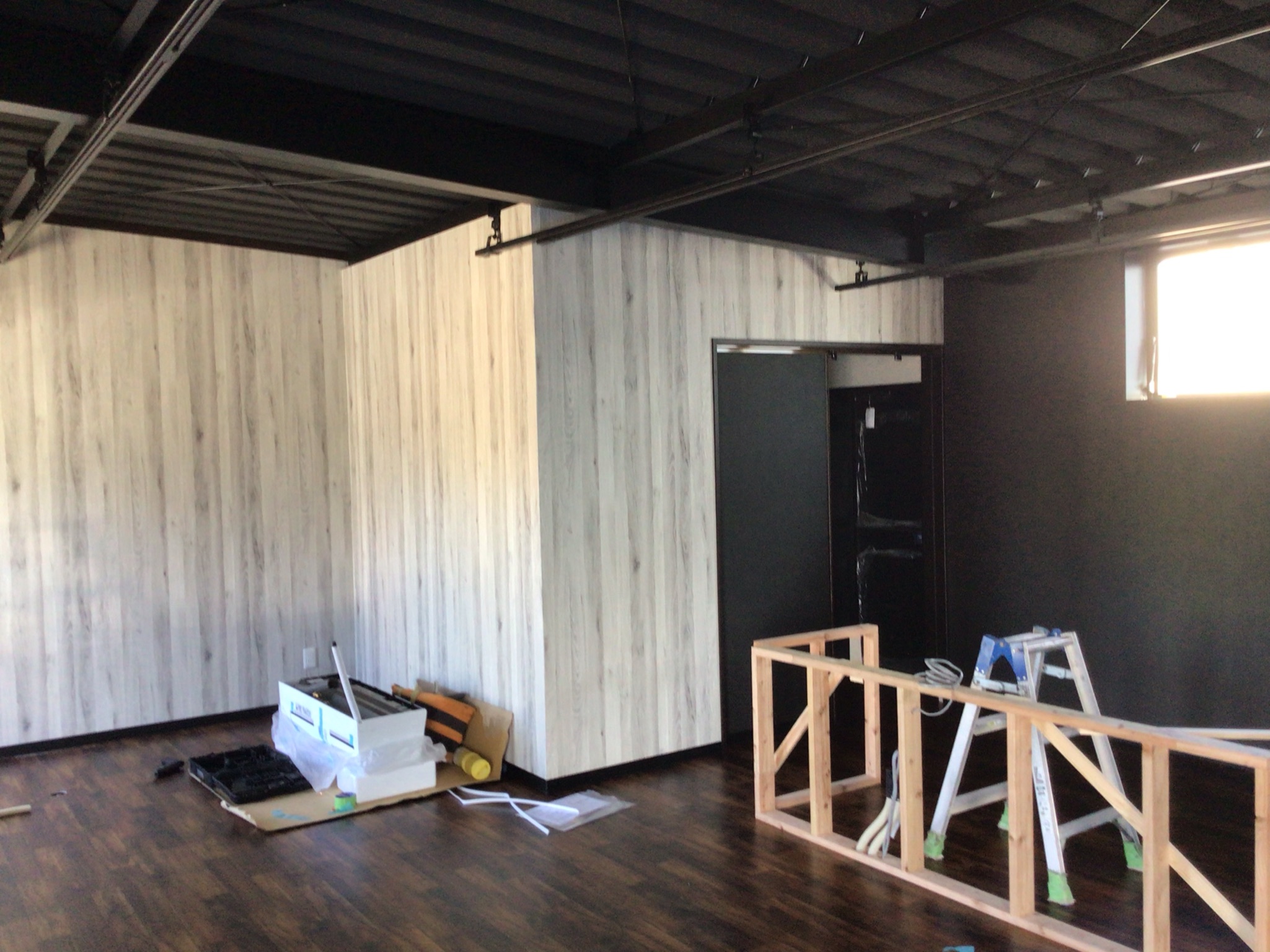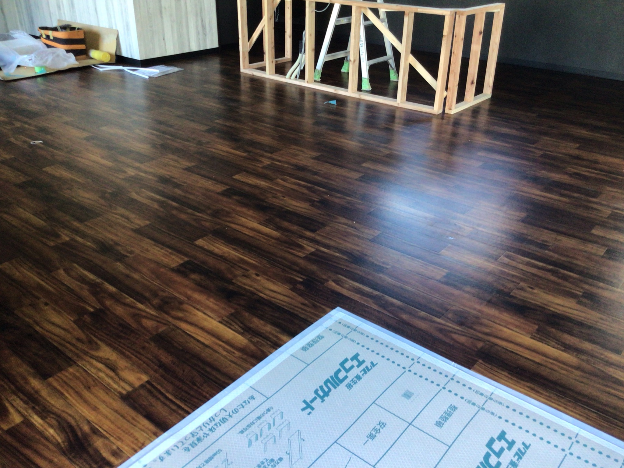 黒色を基調とした壁紙と、深い色合いのアカシア系の床材で、内装工事完了しました。